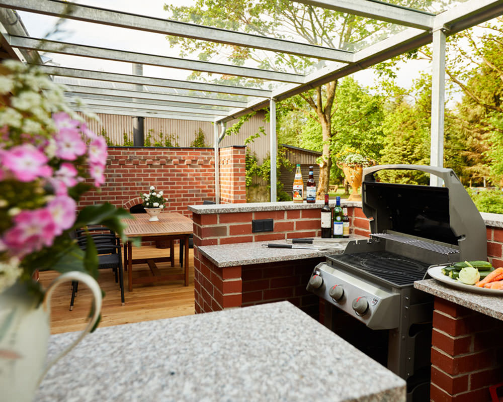 voll ausgestattete Wohnküche & überdachte Terrasse mit Gasgrill und Outdoorküche