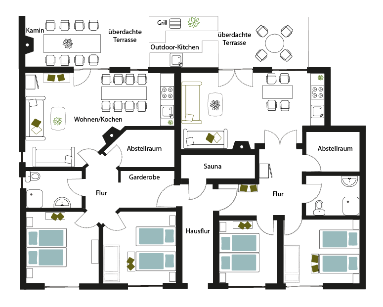 Doppelapartment bis 10 Personen mit Outdoorküche, Kamin und Sauna