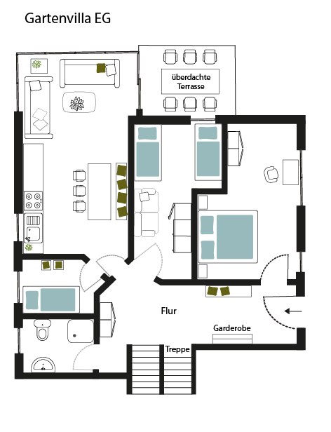 Gartenvilla Erdgeschoss für 5 Personen Das Erdgeschoss der Gartenvilla mit Zugang zum Landhausgarten