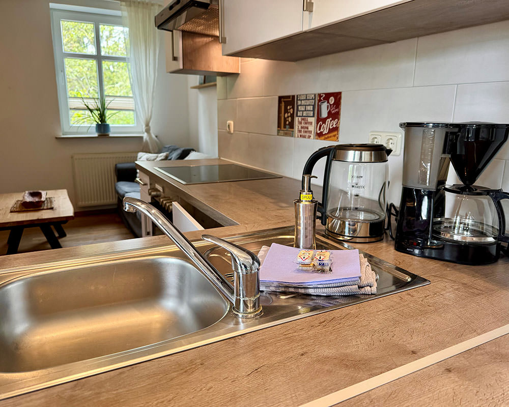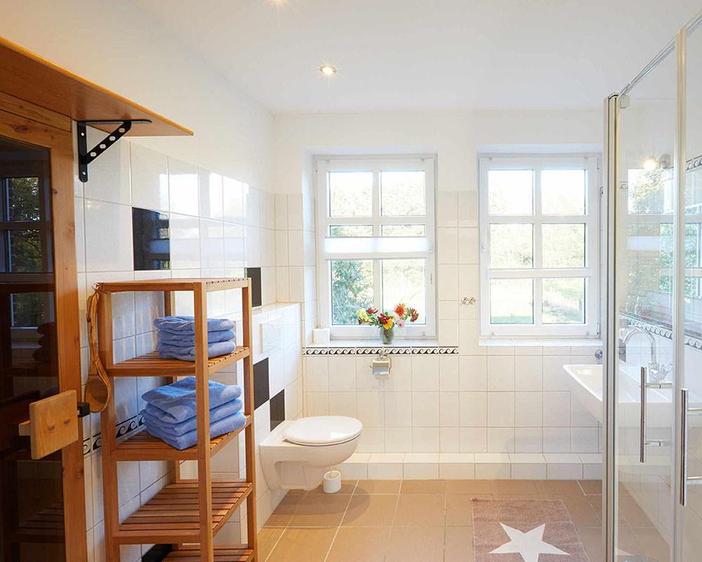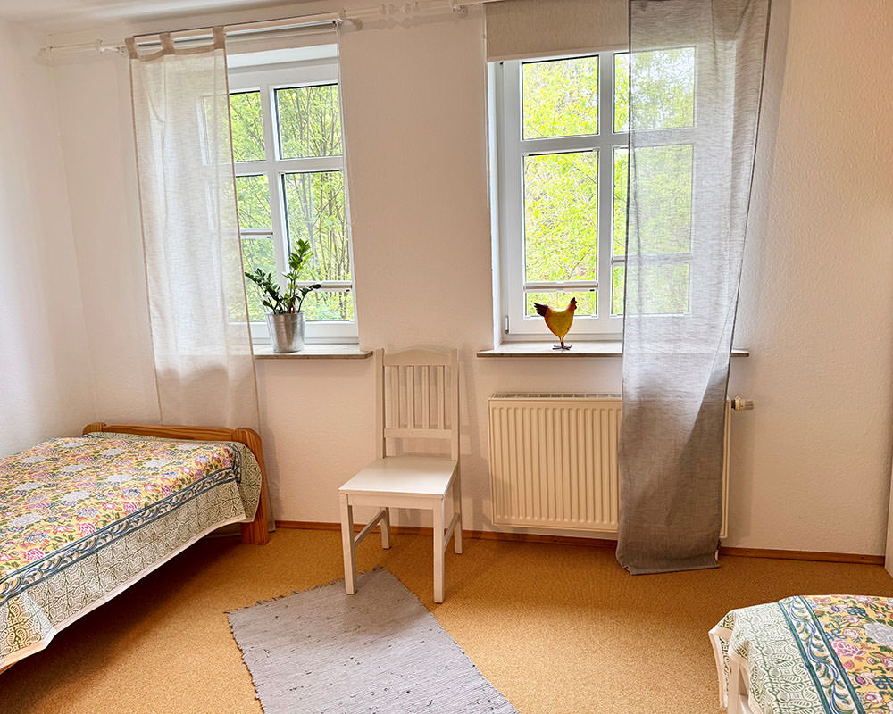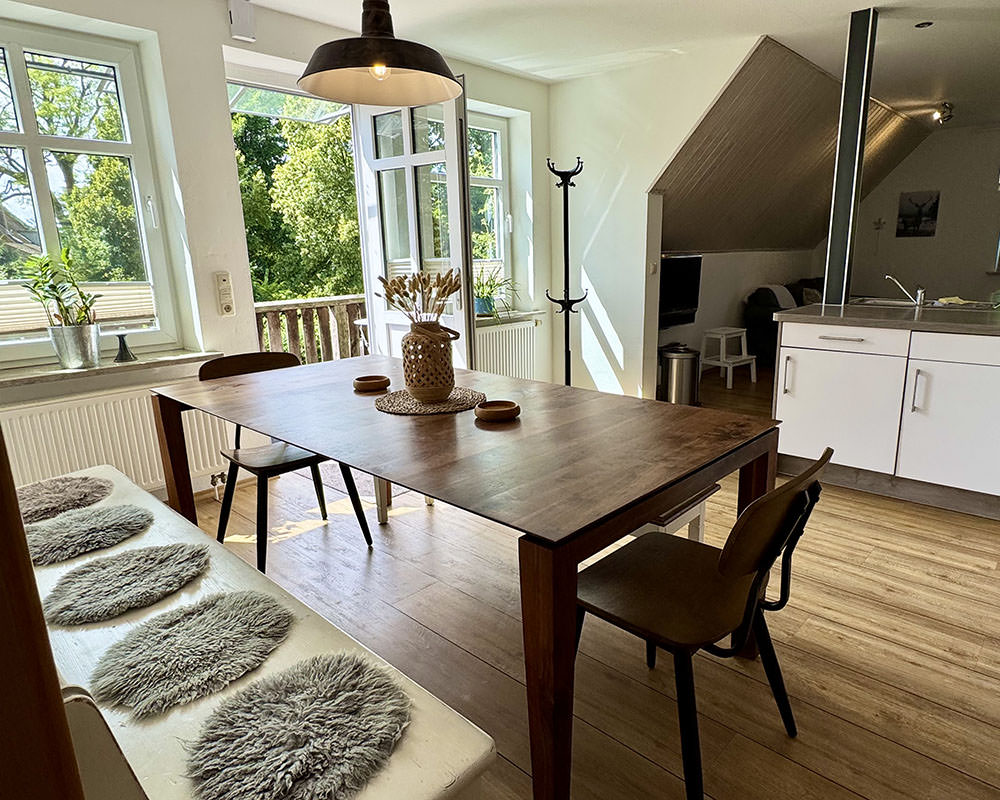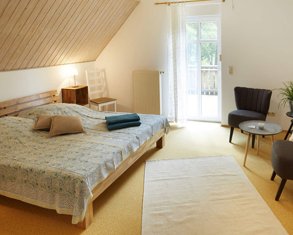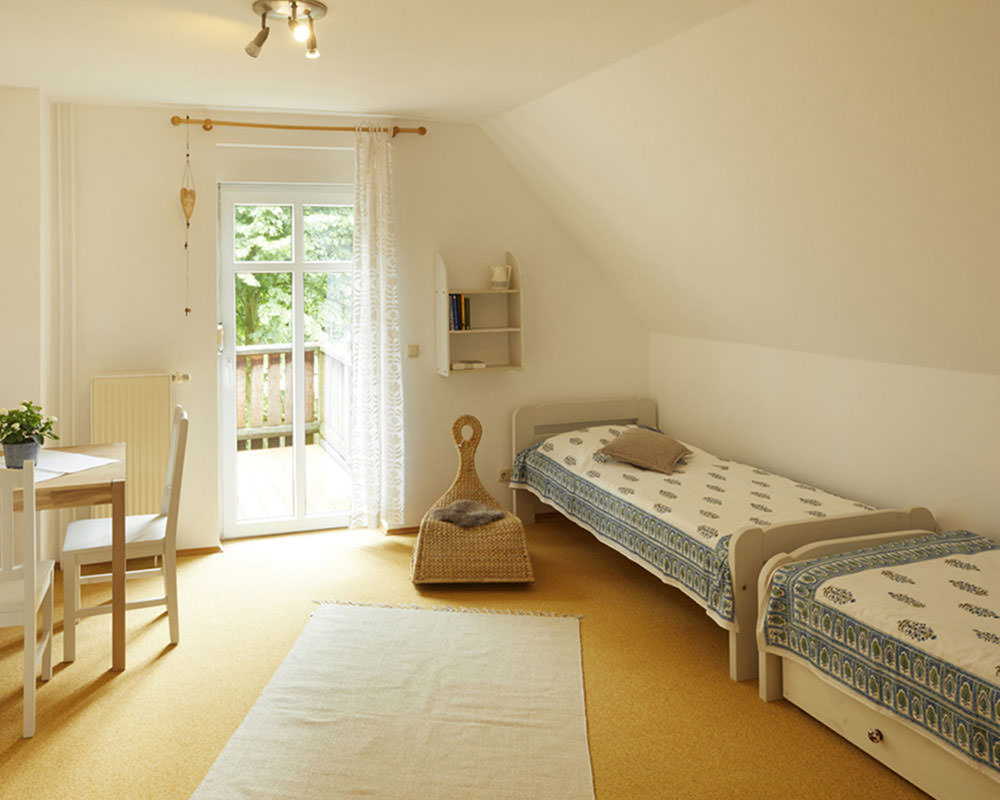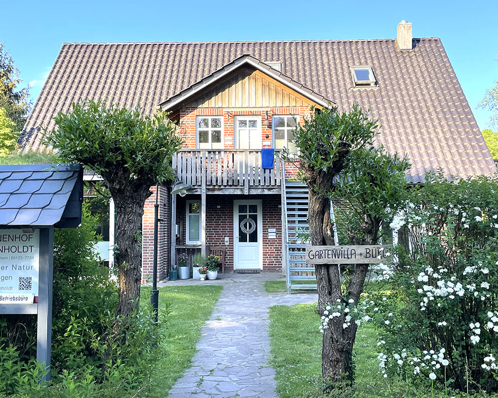 Die Wohnung im Obergeschoss der Gartenvilla bietet auf 160 m² viel Platz für gemeinsame Auszeiten mit Familie oder Freunden. Fünf großzügige Zimmer, zwei Duschbäder und eine voll ausgestattete Wohnküche sorgen für entspannten Komfort für bis zu 11 Personen. Genieße ruhige Stunden auf dem großen Balkon, entspanne in der eigenen Sauna oder nutze den schönen Garten als zusätzlichen Rückzugsort. Im Haus „Gartenvilla“ befindet sich auch unser Büro. Dies ist aber mit einer eigenen Auffahrt versehen und selbstverständlich achten wir die Privatsphäre unserer Gäste. Der Blick ins Grüne und die direkte Nähe zu Spielplatz, Strohburg und Froschteich machen Deinen Aufenthalt perfekt.