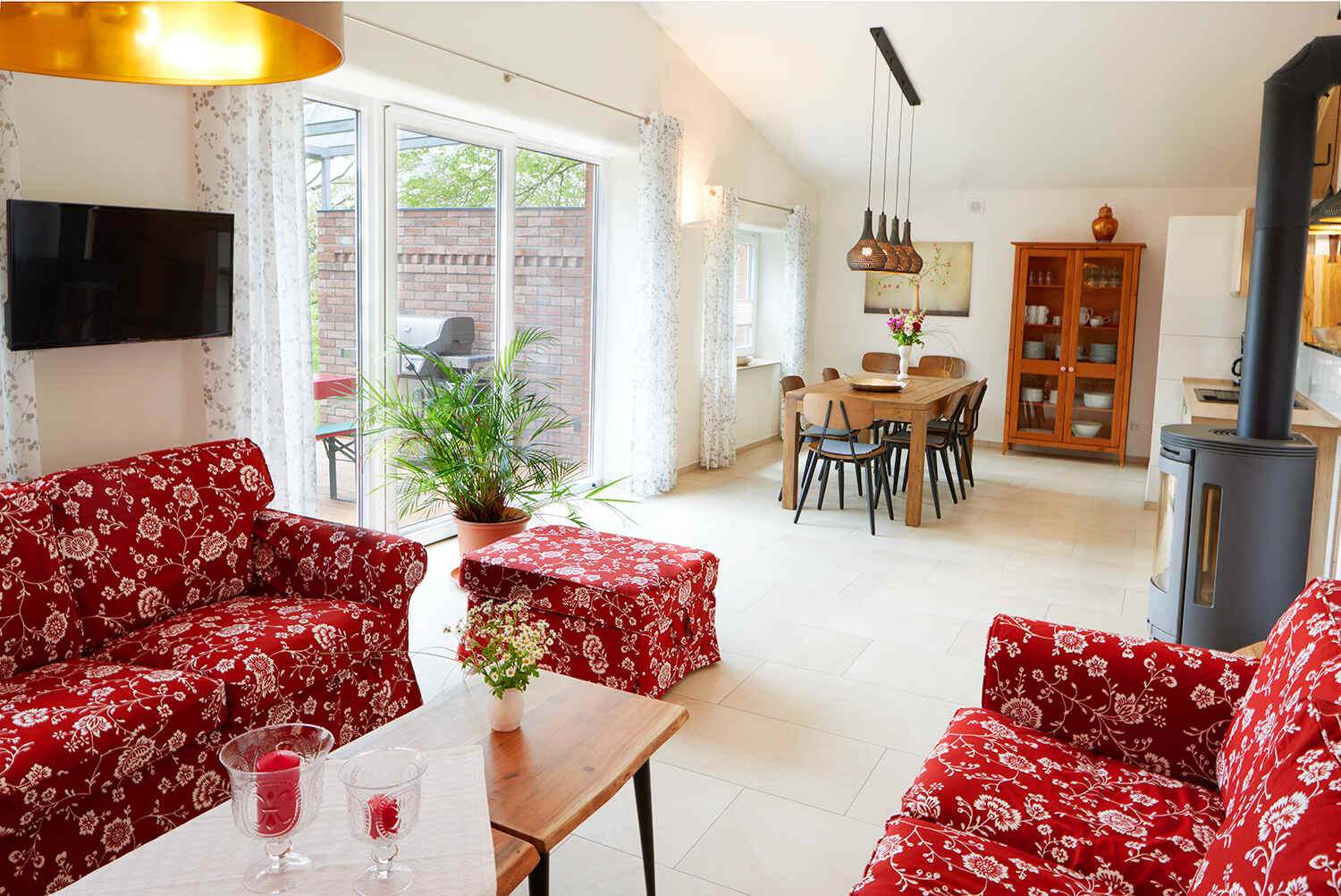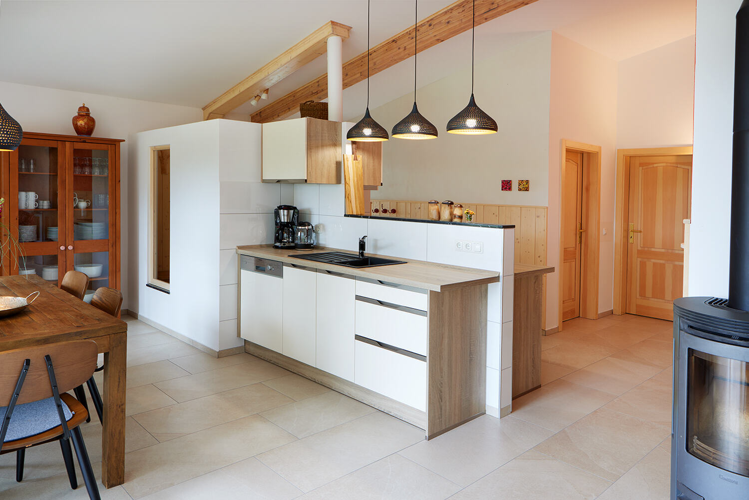Besondere Highlights sind die integrierte Bio-Lehmsauna, der Kaminofen und die überdachte Terrasse mit Gasgrill. Die Wohnung ist barrierearm gestaltet und verfügt über Fußbodenheizung in Küche, Bad und Wohnbereich.