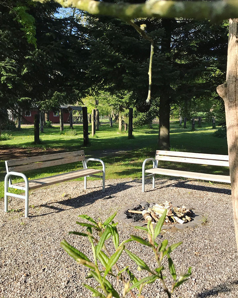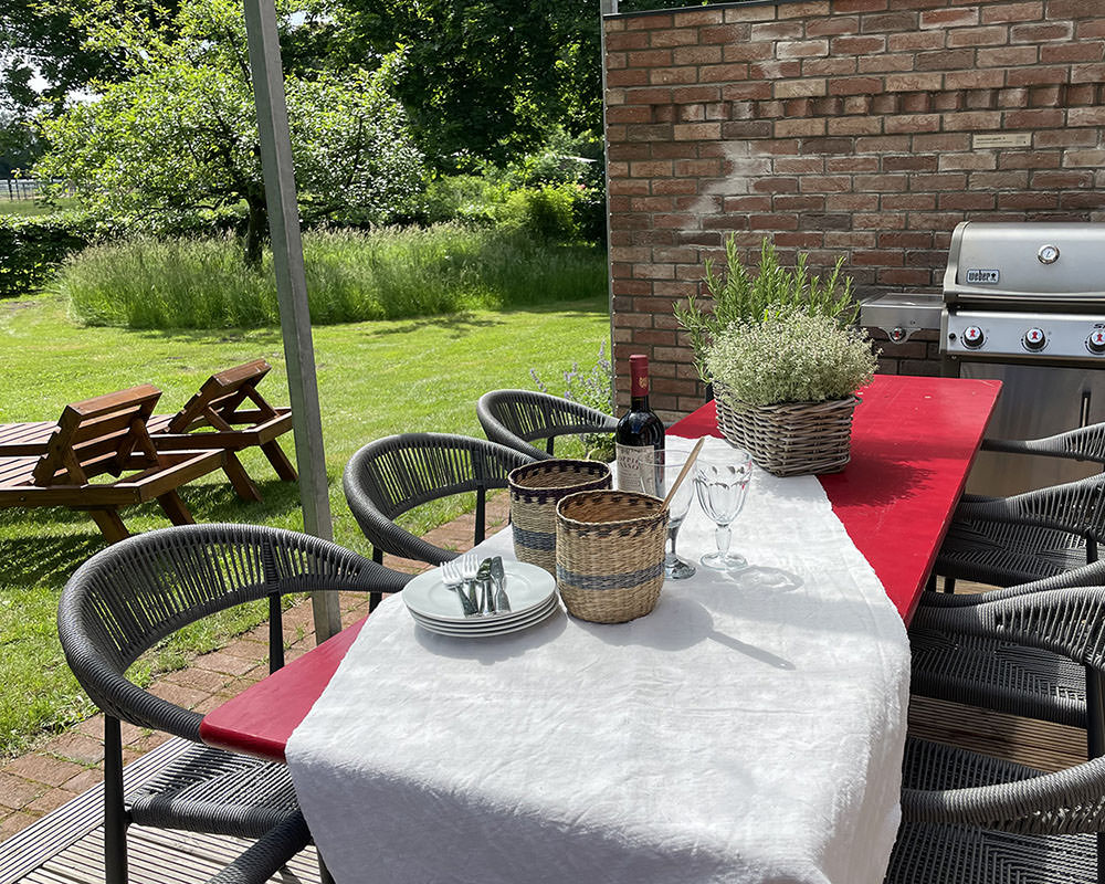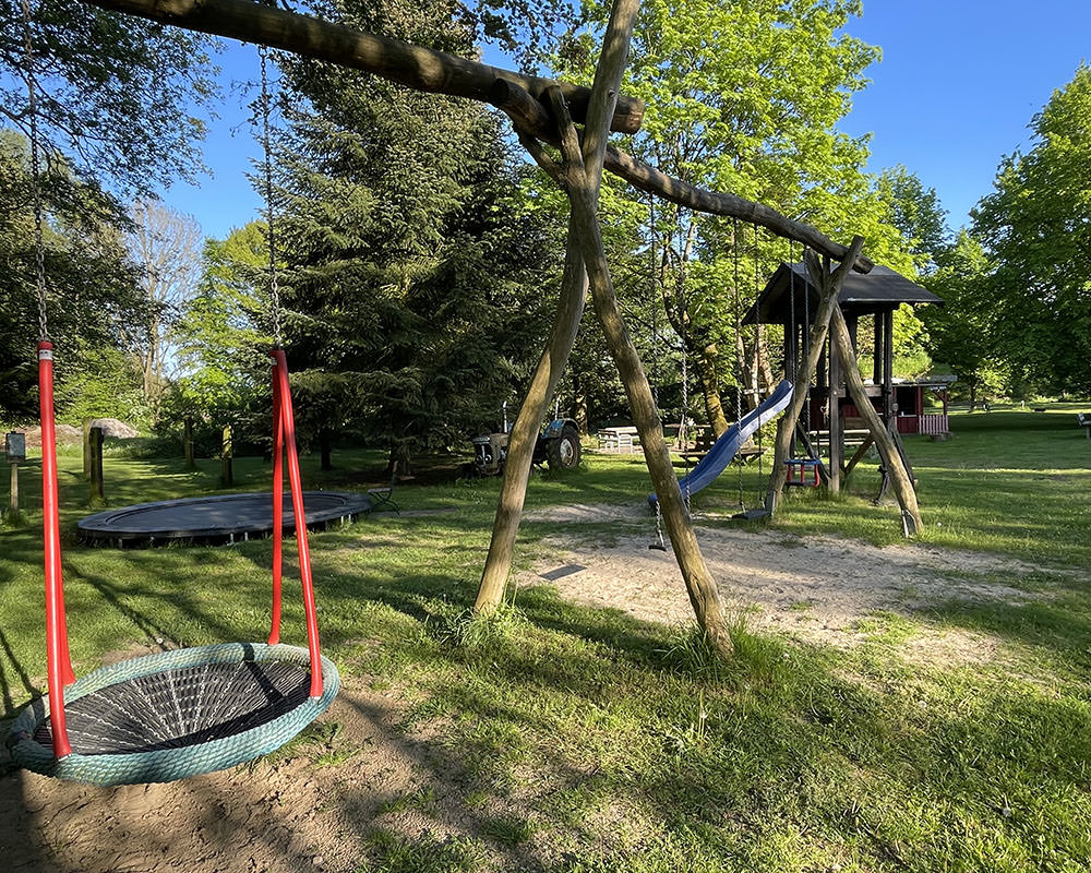 Der große Garten mit alten Obstbäumen lädt zum Entspannen ein, während Kinder sich auf dem weitläufigen Hofgelände mit Spielplatz, Strohburg und Boulderwand austoben können.
