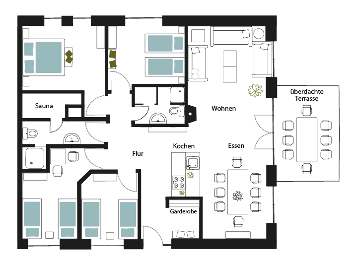 Die Ferienwohnung Rotfichte bietet auf 115 m² großzügigen Raum für bis zu 8 Personen. Mit vier Schlafzimmern, zwei schönen Duschbädern und einer voll ausgestatteten Wohnküche mit großem Esstisch ist sie ideal für Familien oder Gruppen.