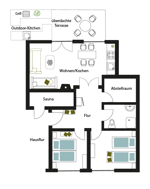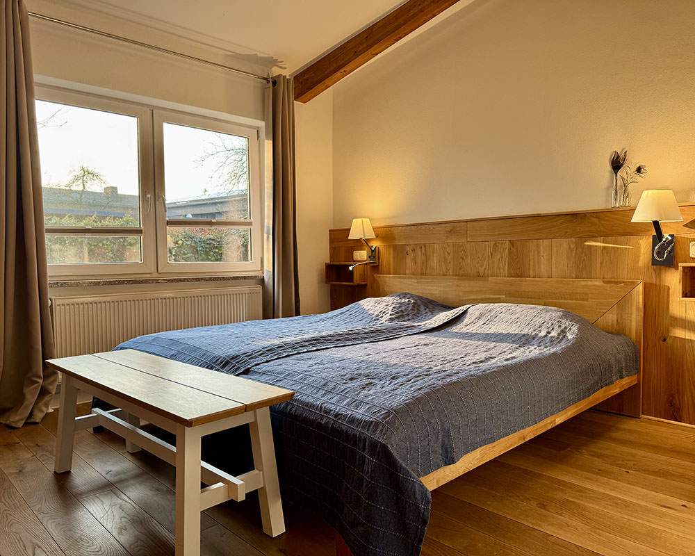 Die Ferienwohnung Schwarzkiefer bietet auf 70 m² Platz für bis zu 5 Personen (mit Beistellbett, sonst 4 Personen). Mit zwei Schlafzimmern, einem barrierefreien Duschbad und einer voll ausgestatteten Wohnküche ist sie ideal für eine Familie oder zwei Paare.