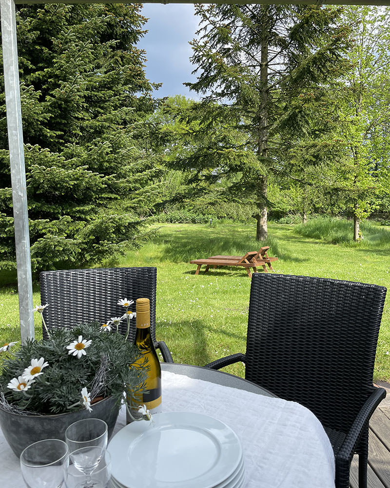 Der angrenzende Gartenbereich lädt zum Entspannen ein, während die Kinder sich auf dem weitläufigen Hofgelände mit Spielplatz, Strohburg und Boulderwand austoben können.